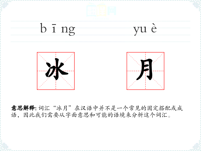 词汇“冰月”在汉语中并不是一个常见的固定搭配或成语,因此我们需要从字面意思和可能的语境来分析这个词汇。