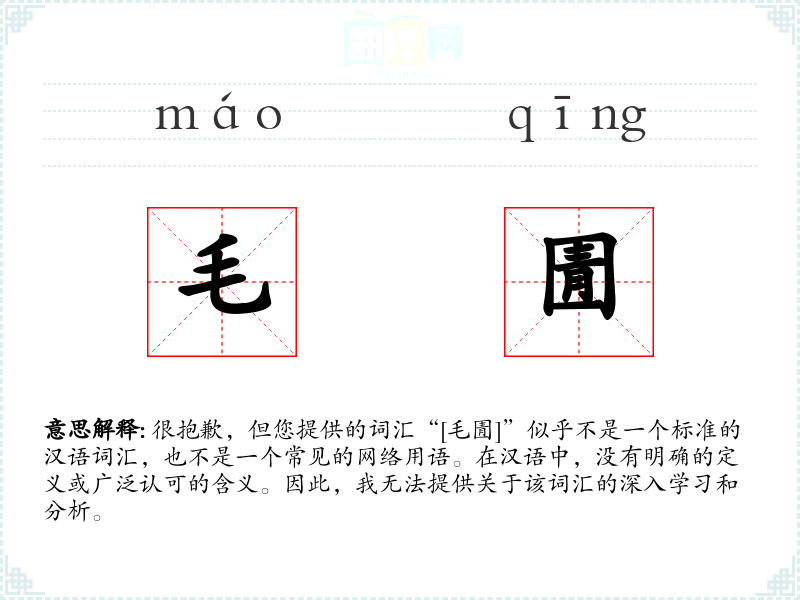 很抱歉,但您提供的词汇“[毛圊]”似乎不是一个标准的汉语词汇,也不是一个常见的网络用语。在汉语中,没有明确的定义或广泛认可的含义。因此,我无法提供关于该词汇的深入学习和分析。
