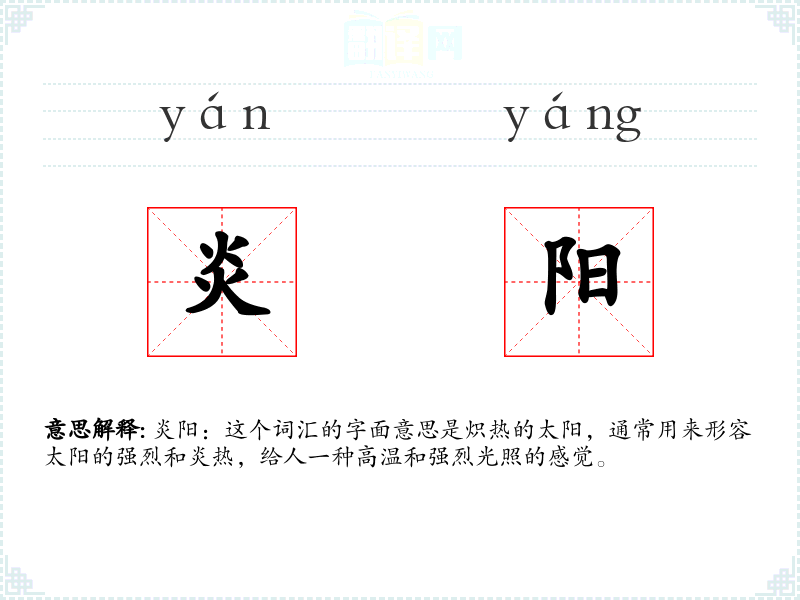 “炎阳”由两个汉字组成,“炎”意为火热的、炽热的,“阳”指太阳。这个词汇在中文中的使用历史悠久,主要用来形容太阳的强烈和炎热。