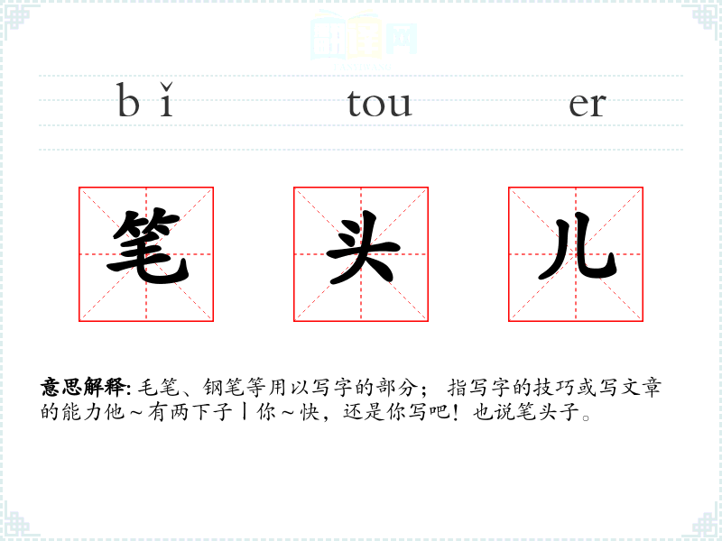 毛笔、钢笔等用以写字的部分; 指写字的技巧或写文章的能力他~