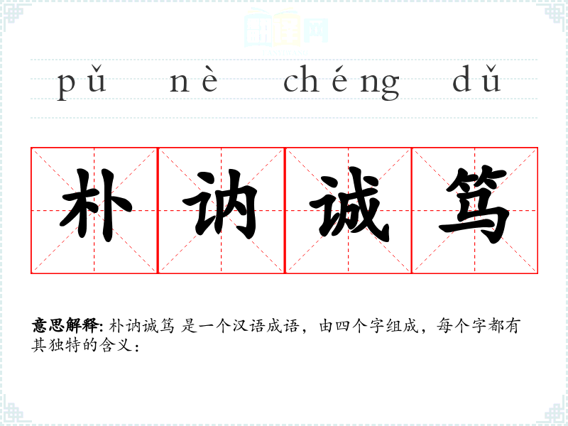 朴讷诚笃 是一个汉语成语,由四个字组成,每个字都有其独特的含义:
