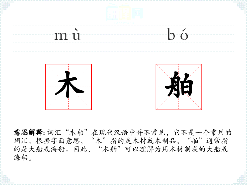 - 词源:“木”和“舶”都是汉语中的基本词汇,组合起来形成了一个描述特定类型船舶的词汇。