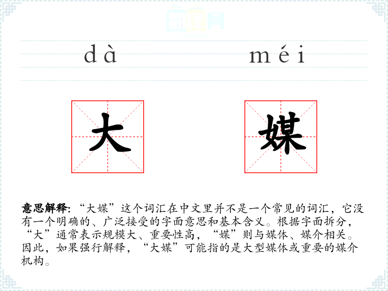 “大媒”这个词汇在中文里并不是一个常见的词汇,它没有一个明确的、广泛接受的字面意思和基本含义。根据字面拆分,“大”通常表示规模大、重要性高,“媒”则与媒体、媒介相关。因此,如果强行解释,“大媒”可能指的是大型媒体或重要的媒介机构。