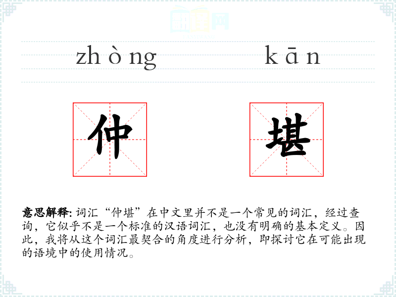由于“仲堪”不是一个标准汉语词汇,我们无法给出一个确切的基本定义。它可能是某个特定领域或方言中的词汇,或者是某个特定人物的名字。