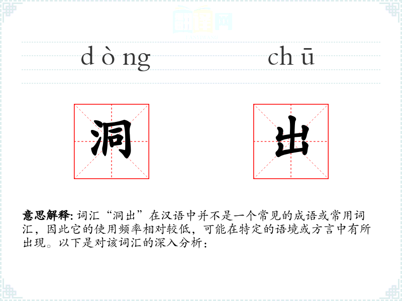 词汇“洞出”在汉语中并不是一个常见的成语或常用词汇,因此它的使用频率相对较低,可能在特定的语境或方言中有所出现。以下是对该词汇的深入分析: