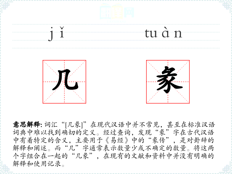 “彖”字源自古代,与《易经》紧密相关,而“几”字则是一个常用字,表示数量。组合后的“几彖”可能是一个特定文献中的术语,但其具体含义和使用情况需要进一步的文献研究。