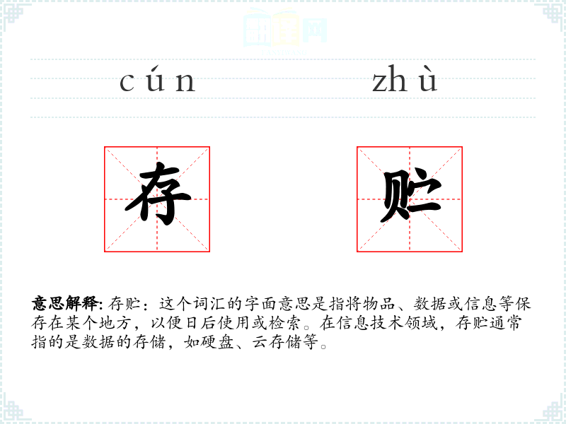 存贮:这个词汇的字面意思是指将物品、数据或信息等保存在某个地方,以便日后使用或检索。在信息技术领域,存贮通常指的是数据的存储,如硬盘、云存储等。