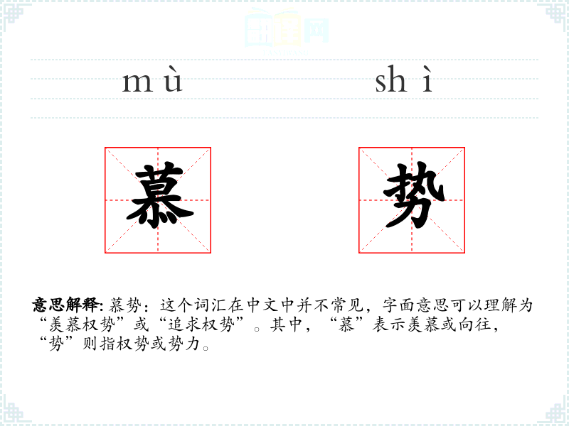 慕势:这个词汇在中文中并不常见,字面意思可以理解为“羡慕权势”或“追求权势”。其中,“慕”表示羡慕或向往,“势”则指权势或势力。