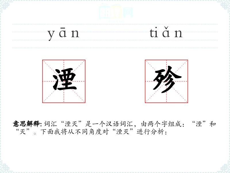 “湮”字古汉语中意为埋没、淹没,“灭”字意为消灭、消失。两个字组合起来,形成了“湮灭”这个词汇,强调彻底的消失和毁灭。