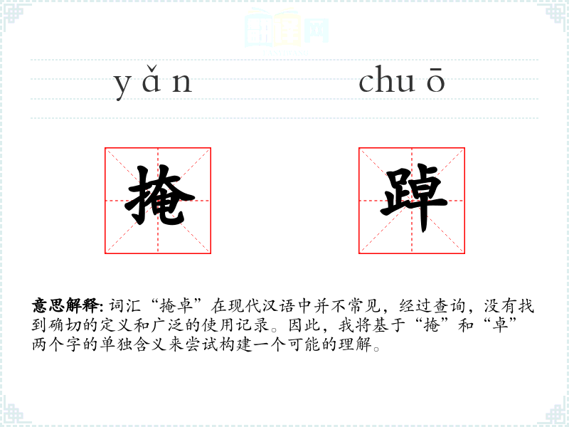 词汇“掩卓”在现代汉语中并不常见,经过查询,没有找到确切的定义和广泛的使用记录。因此,我将基于“掩”和“卓”两个字的单独含义来尝试构建一个可能的理解。