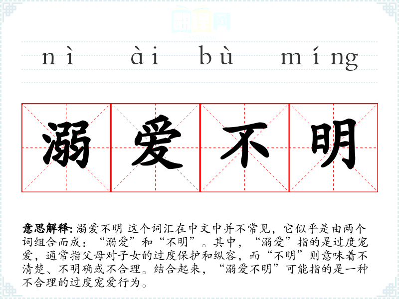 由于“溺爱不明”不是一个常用词汇,其词源和演变不太明确。但“溺爱”一词在古代文献中已有出现,如《左传》中提到“溺爱之子,不可使知”,而“不明”则是一个常用词汇,意指不清楚或不合理。