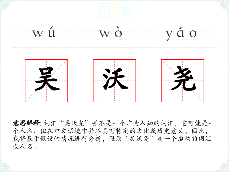 “吴沃尧”作为一个词汇,如果它是一个人名,那么它的字面意思可能没有特定的含义,而是由姓氏“吴”和两个字“沃尧”组成。在中文命名习惯中,姓氏通常放在前面,而名字则可能包含特定的寓意或文化含义。
