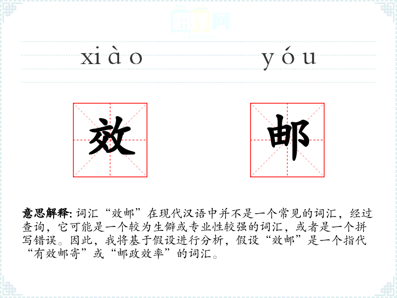 词汇“效邮”在现代汉语中并不是一个常见的词汇,经过查询,它可能是一个较为生僻或专业性较强的词汇,或者是一个拼写错误。因此,我将基于假设进行分析,假设“效邮”是一个指代“有效邮寄”或“邮政效率”的词汇。