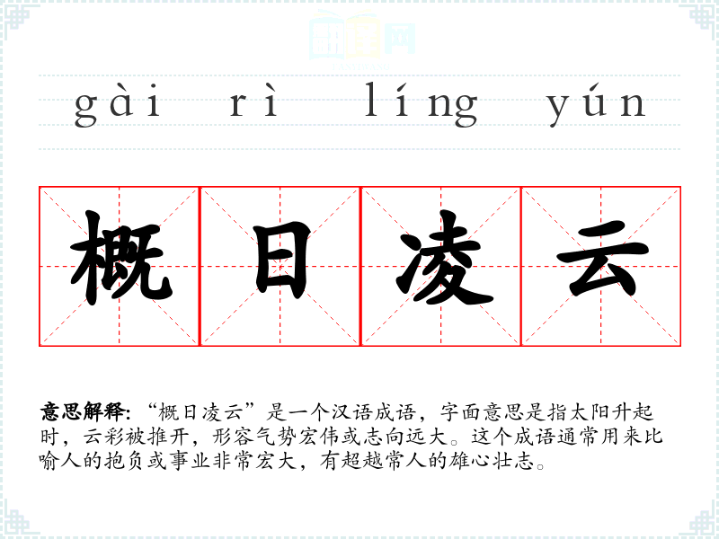“概日凌云”是一个汉语成语,字面意思是指太阳升起时,云彩被推开,形容气势宏伟或志向远大。这个成语通常用来比喻人的抱负或事业非常宏大,有超越常人的雄心壮志。