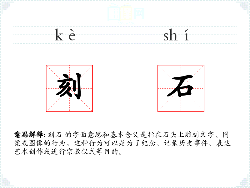 刻石 的字面意思和基本含义是指在石头上雕刻文字、图案或图像的行为。这种行为可以是为了纪念、记录历史、表达艺术创作或进行仪式等目的。