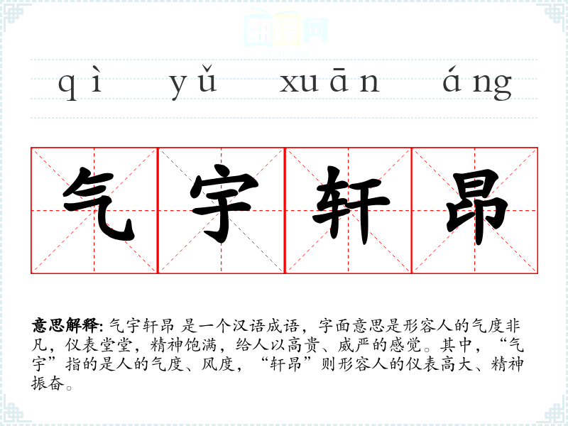 气宇轩昂 这个成语不仅是对人外在形象的描述,更是对其内在品质的肯定。在学语言和表达中,理解和运用这样的成语能够丰富我们的词汇量,提升我们的表达能力,使我们在描述人物时更加生动和准确。通过深入学和分析,我更加认识到成语在汉语中的重要性和魅力。