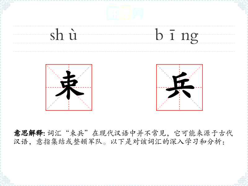 词汇“束兵”在现代汉语中并不常见,它可能来源于古代汉语,意指集结或整顿军队。以下是对该词汇的深入学*和分析:
