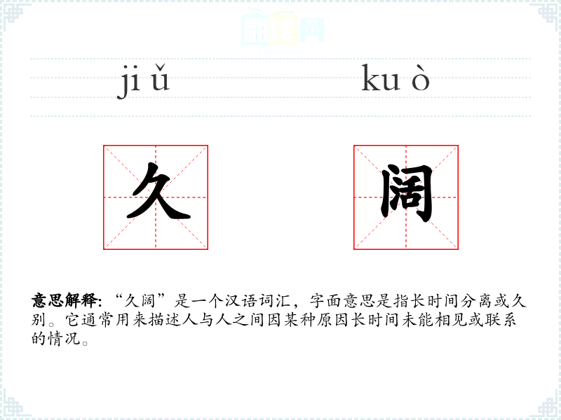 “久阔”是一个汉语词汇,字面意思是指长时间分离或久别。它通常用来描述人与人之间因某种原因长时间未能相见或联系的情况。