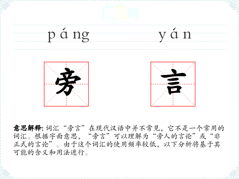 词汇“旁言”在现代汉语中并不常见,它不是一个常用的词汇。根据字面意思,“旁言”可以理解为“旁人的言论”或“非正式的言论”。由于这个词汇的使用频率较低,以下分析将基于其可能的含义和用法进行。