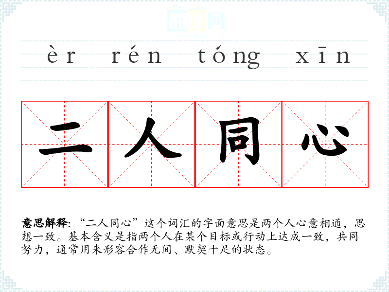 “二人同心”这个词汇的字面意思是两个人心意相通,思想一致。基本含义是指两个人在某个目标或行动上达成一致,共同努力,通常用来形容合作无间、默契十足的状态。