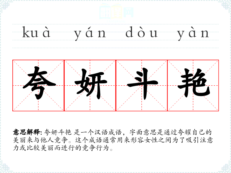 夸妍斗艳 是一个汉语成语,字面意思是通过夸耀自己的美丽来与他人竞争。这个成语通常用来形容女性之间为了吸引注意力或比较美丽而进行的竞争行为。