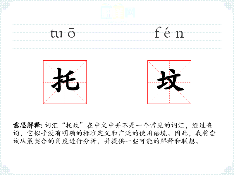 词汇“托坟”在中文中并不是一个常见的词汇,经过查询,它似乎没有明确的标准定义和广泛的使用语境。因此,我将尝试从最契合的角度进行分析,并提供一些可能的解释和联想。