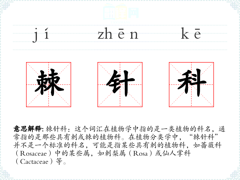 “棘针科”这个词汇可能是由“棘”(指尖锐的刺)和“针”(细长尖锐的物体)组合而成,用来形容那些具有类似特征的植物。在植物学中,科名的命名通常基于该科植物的显著特征或模式物种。
