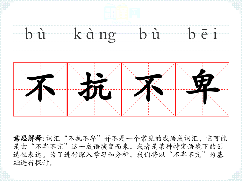 词汇“不抗不卑”并不是一个常见的成语或词汇,它可能是由“不卑不亢”这一成语演变而来,或者是某种特定语境下的创造性表达。为了进行深入学*和分析,我们将以“不卑不亢”为基础进行探讨。