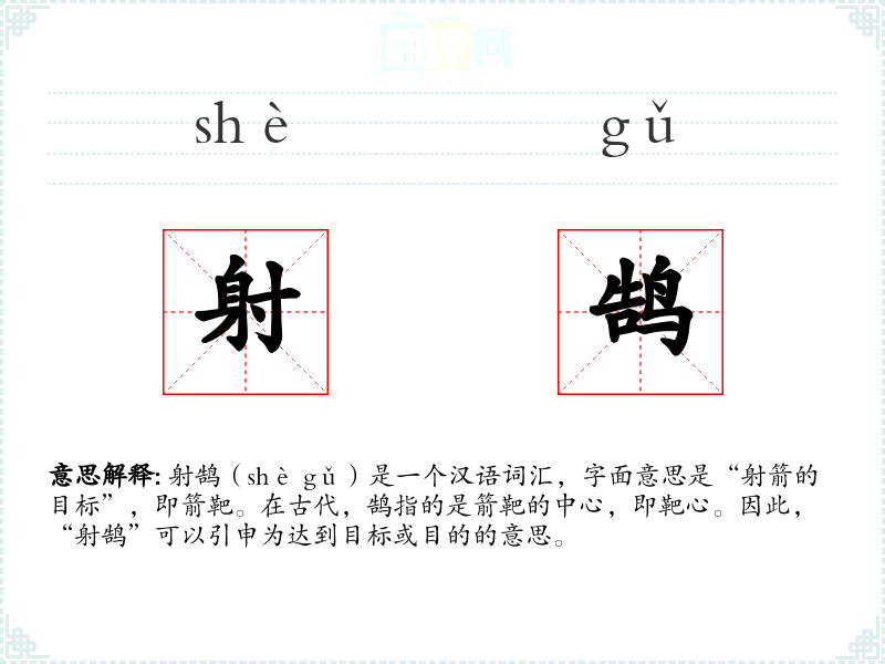 射鹄(shè gǔ)是一个汉语词汇,字面意思是“射箭的目标”,即箭靶。在古代,鹄指的是箭靶的中心,即靶心。因此,“射鹄”可以引申为达到目标或目的的意思。