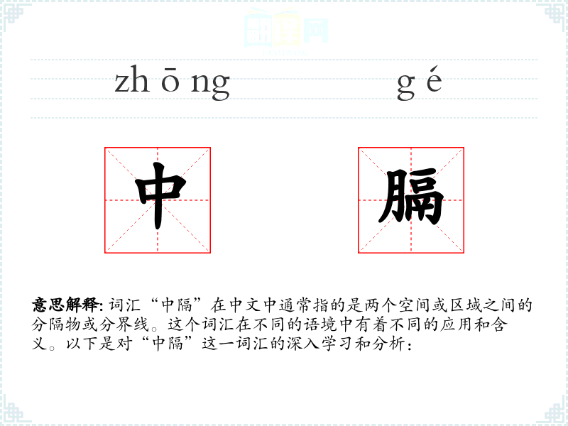 词汇“中隔”在中文中通常指的是两个空间或区域之间的分隔物或分界线。这个词汇在不同的语境中有着不同的应用和含义。以下是对“中隔”这一词汇的深入学习和分析: