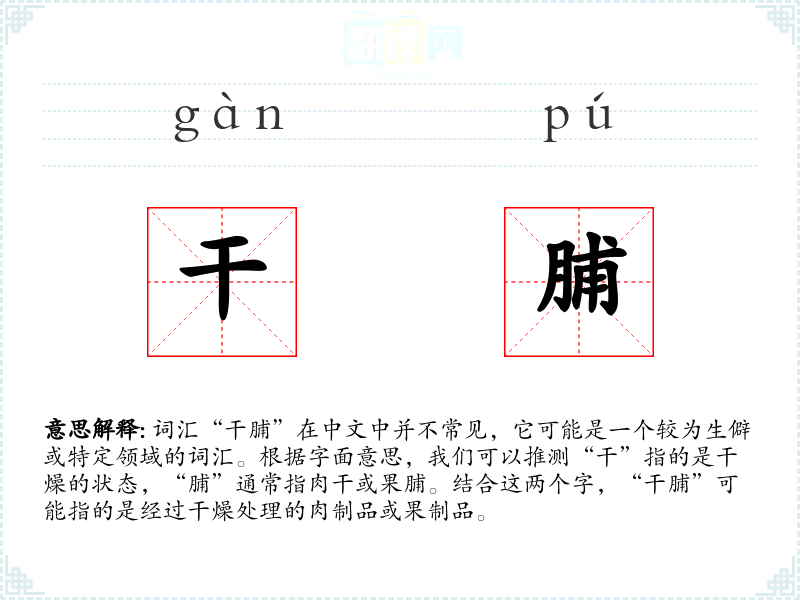 - 词源:“干”和“脯”都是古代汉语词汇,分别表示干燥和肉制品。