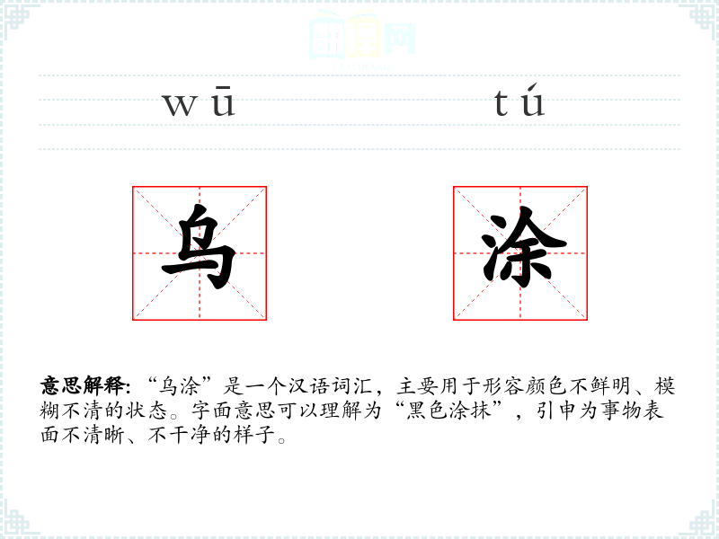 “乌涂”一词的词源较为简单,由“乌”(黑色)和“涂”(涂抹)组成,随着语言的发展,其含义逐渐固定为形容不清晰、不鲜明的状态。