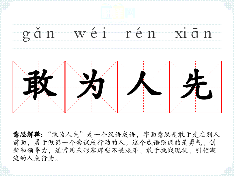 “敢为人先”是一个汉语成语,字面意思是敢于走在别人前面,勇于做第一个尝试或行动的人。这个成语强调的是勇气、创新和领导力,通常用来形容那些不畏艰难、敢于挑战现状、引领潮流的人或行为。