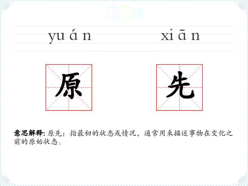 原先:指最初的状态或情况,通常用来描述事物在变化之前的原始状态。