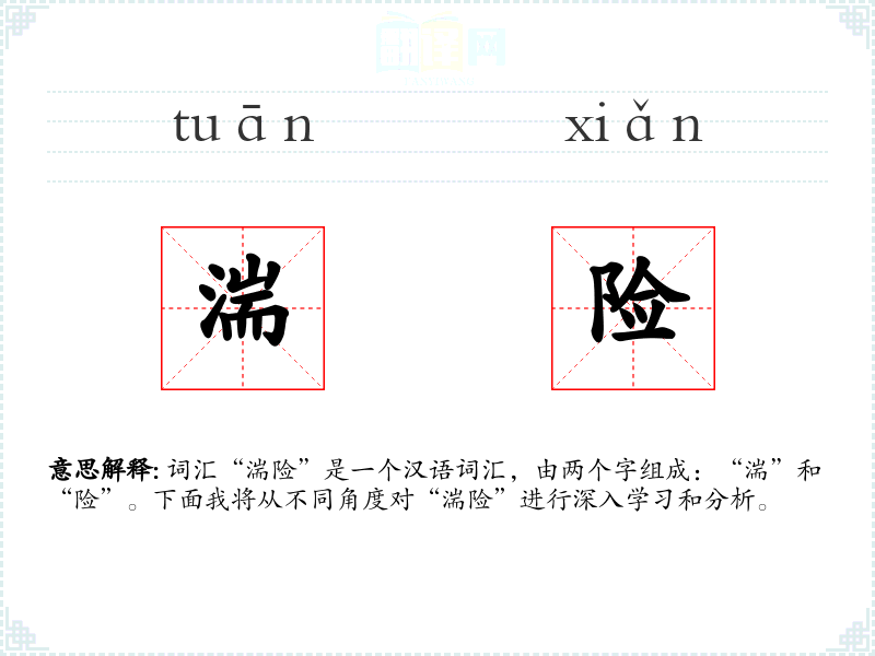 词汇“湍险”是一个汉语词汇,由两个字组成:“湍”和“险”。下面我将从不同角度对“湍险”进行深入学*和分析。