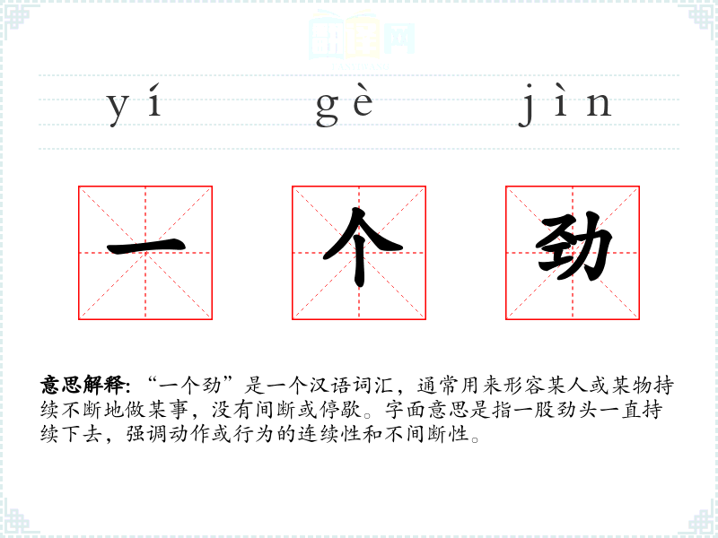 “一个劲”是一个汉语词汇,通常用来形容某人或某物持续不断地做某事,没有间断或停歇。字面意思是指一股劲头一直持续下去,强调动作或行为的连续性和不间断性。