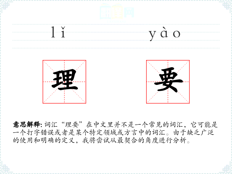 由于“理要”不是一个标准词汇,我们无法给出一个确切的字面意思和基本含义。它可能是“理解”和“要求”两个词汇的组合,或者是某个特定语境下的缩写或方言词汇。