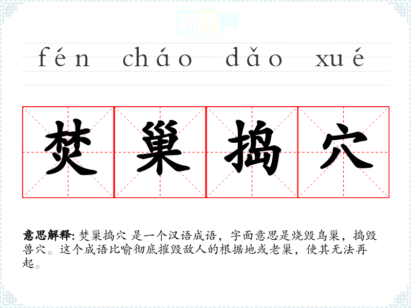 焚巢捣穴 是一个汉语成语,字面意思是烧毁鸟巢,捣毁兽穴。这个成语比喻彻底摧毁敌人的根据地或老巢,使其无法再起。