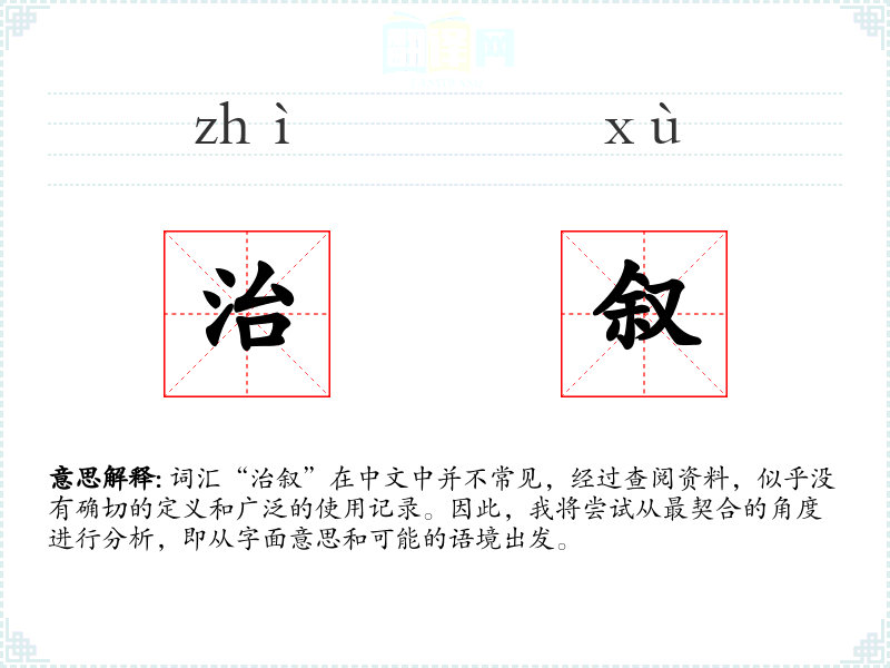 词汇“治叙”在中文中并不常见,经过查阅资料,似乎没有确切的定义和广泛的使用记录。因此,我将尝试从最契合的角度进行分析,即从字面意思和可能的语境出发。