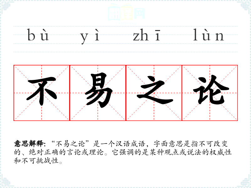 “不易之论”是一个汉语成语,字面意思是指不可改变的、绝对正确的言论或理论。它强调的是某种观点或说法的权威性和不可挑战性。