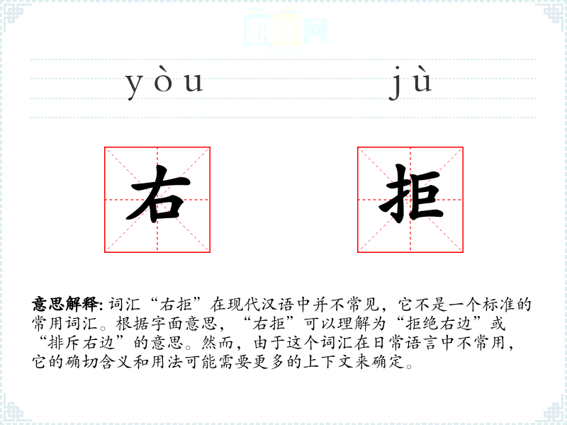 “右拒”字面意思是指对右边的拒绝或排斥。但在实际语言使用中,这个词汇并不常见,可能需要结合具体语境来理解其含义。