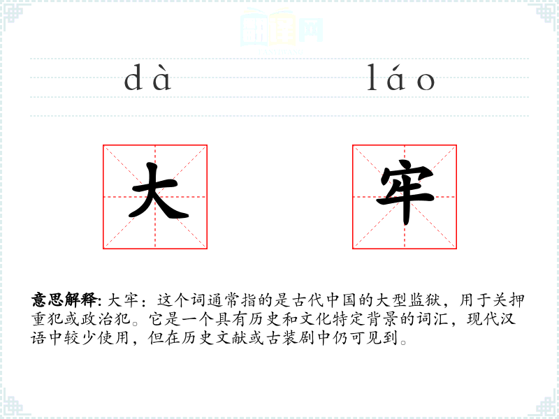 大牢:这个词通常指的是古代**的大型监狱,用于关押重犯或政治犯。它是一个具有历史和文化特定背景的词汇,现代汉语中较少使用,但在历史文献或古装剧中仍可见到。