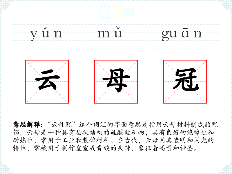 “云母冠”这个词汇的字面意思是指用云母材料制成的冠饰。云母是一种具有层状结构的硅酸盐矿物,具有良好的绝缘性和耐热性,常用于工业和装饰材料。在古代,云母因其透明和闪光的特性,常被用于制作皇室或贵族的头饰,象征着高贵和神圣。