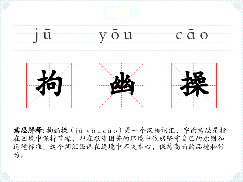 拘幽操(jū yōu cāo)是一个汉语词汇,字面意思是指在困境中保持节操,即在艰难困苦的环境中依然坚守自己的原则和道德标准。这个词汇强调在逆境中不失本心,保持高尚的品德和行为。