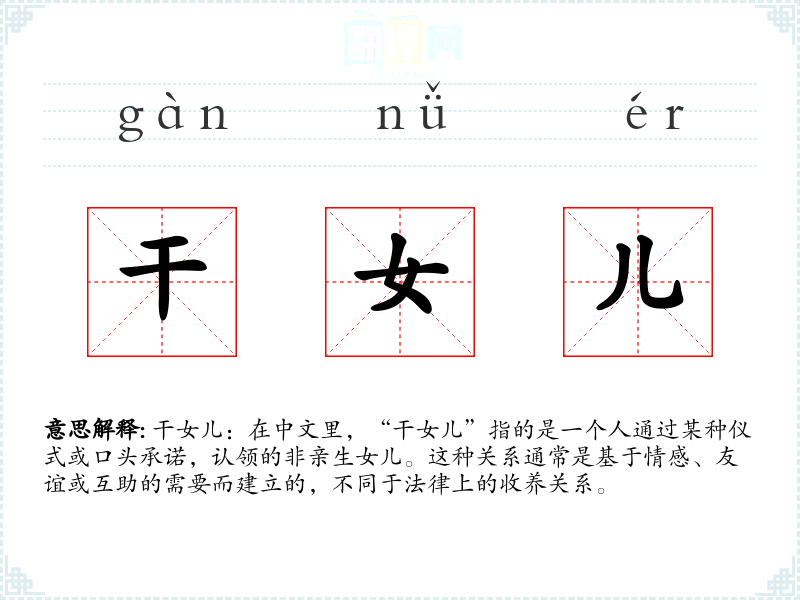 干女儿:在中文里,“干女儿”指的是一个人通过某种仪式或口头承诺,认领的非亲生女儿。这种关系通常是基于情感、友谊或互助的需要而建立的,不同于法律上的收养关系。