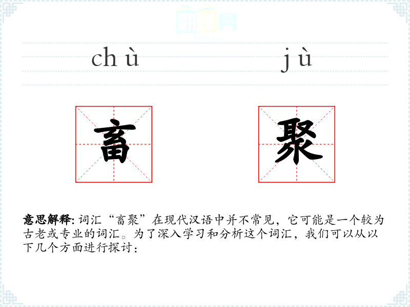 词汇“畜聚”在现代汉语中并不常见,它可能是一个较为古老或专业的词汇。为了深入学习和分析这个词汇,我们可以从以下几个方面进行探讨: