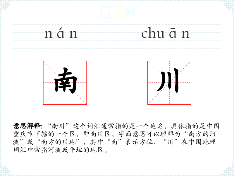 “南川”这个词汇通常指的是一个地名,具体指的是重庆市下辖的一个区,即南川区。字面意思可以理解为“南方的河流”或“南方的川地”,其中“南”表示方位,“川”在地理词汇中常指河流或平坦的地区。