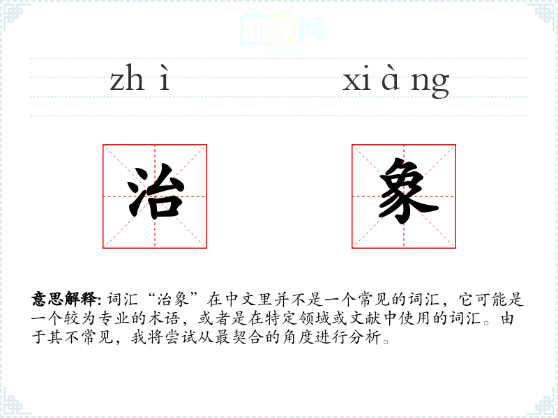 词汇“治象”在中文里并不是一个常见的词汇,它可能是一个较为专业的术语,或者是在特定领域或文献中使用的词汇。由于其不常见,我将尝试从最契合的角度进行分析。