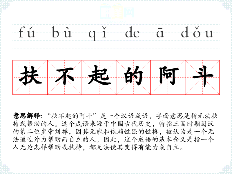 在其他文化中,可能没有直接对应这个成语的词汇,但类似的表达或概念可能存在。例如,在英语中,可能用“a lost cause”或“hopeless case”来表达类似的含义,但这些表达没有“扶不起的阿斗”那样具体的历史和文化背景。