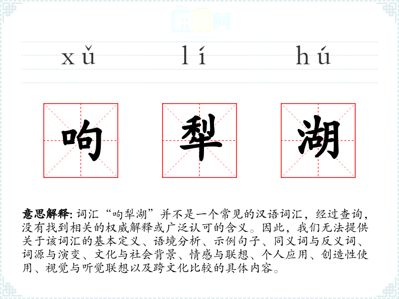 词汇“呴犁湖”并不是一个常见的汉语词汇,经过查询,没有找到相关的权威解释或广泛认可的含义。因此,我们无法提供关于该词汇的基本定义、语境分析、示例句子、同义词与反义词、词源与演变、文化与社会背景、情感与联想、个人应用、创造性使用、视觉与听觉联想以及跨文化比较的具体内容。